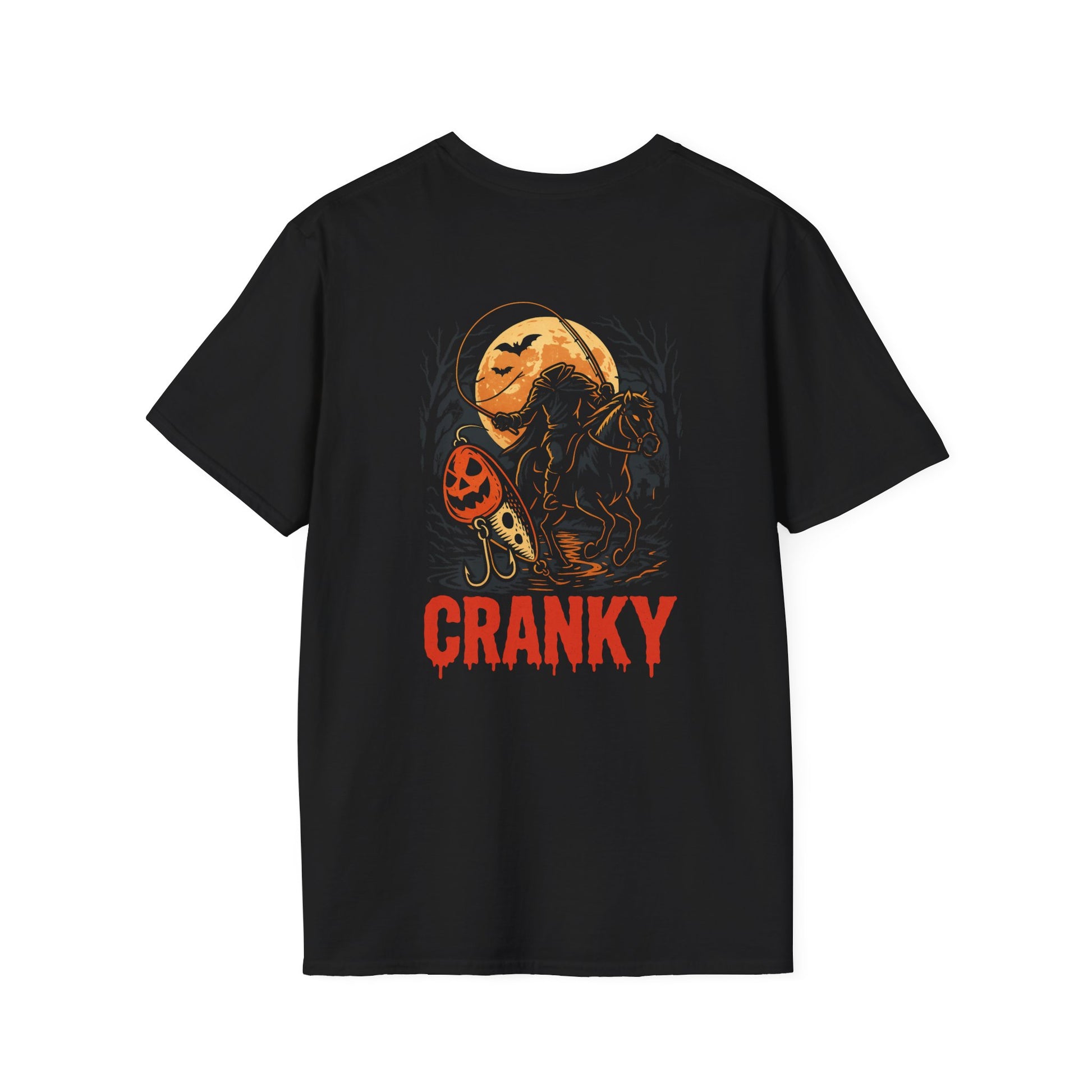 Small front print features a mini Cranky Fishing pumpkin lure logo, perfect for a clean chest hit that shows your spooky angler pride.